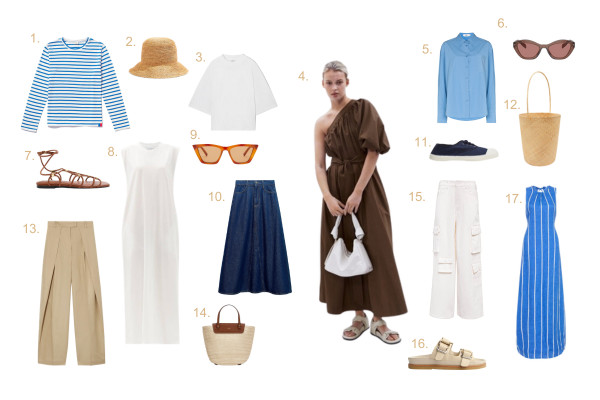 - Stripe Long Sleeve // 2. Straw Hat // 3. White T-Shirt // 4. One Shoulder Dress // 5. Blue Shirt // 6. Sunglasses // 7. Wrap Sandals // 8. White Maxi Dress// 9. Velodrome Sunglasses // 10. Denim Skirt // 11. Navy Sneakers // 12. Bucket Bag // 13. Wide Leg Pants // 14. Basket Tote// 15. White Cargo Pants //16. Buckle Sandals // 17. Stripe Dress