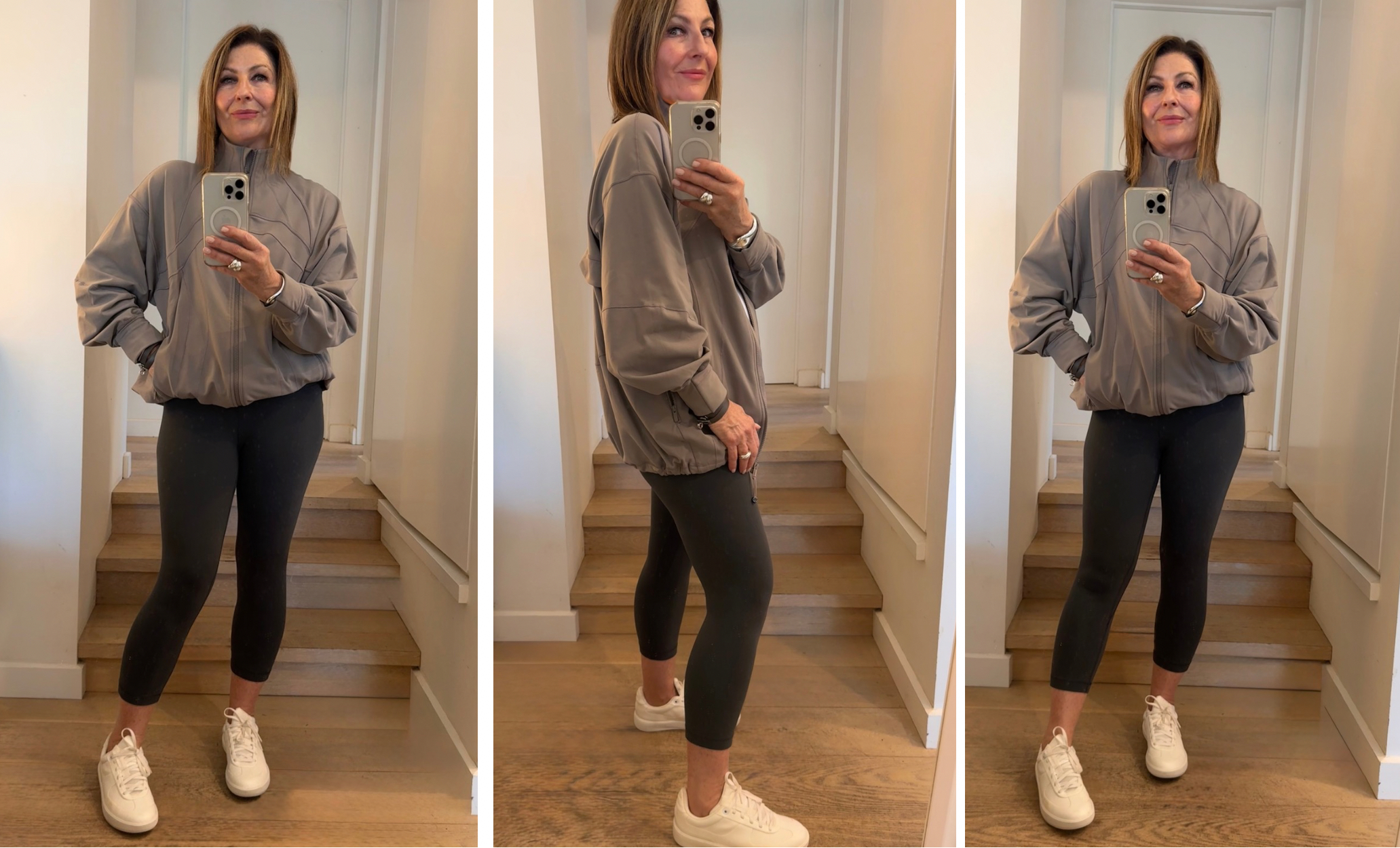 * Or toss the oversized jacket back with leggins & sneakers both ( you can wear the jacket cinched in short …or wear it long hanging over the leggings)