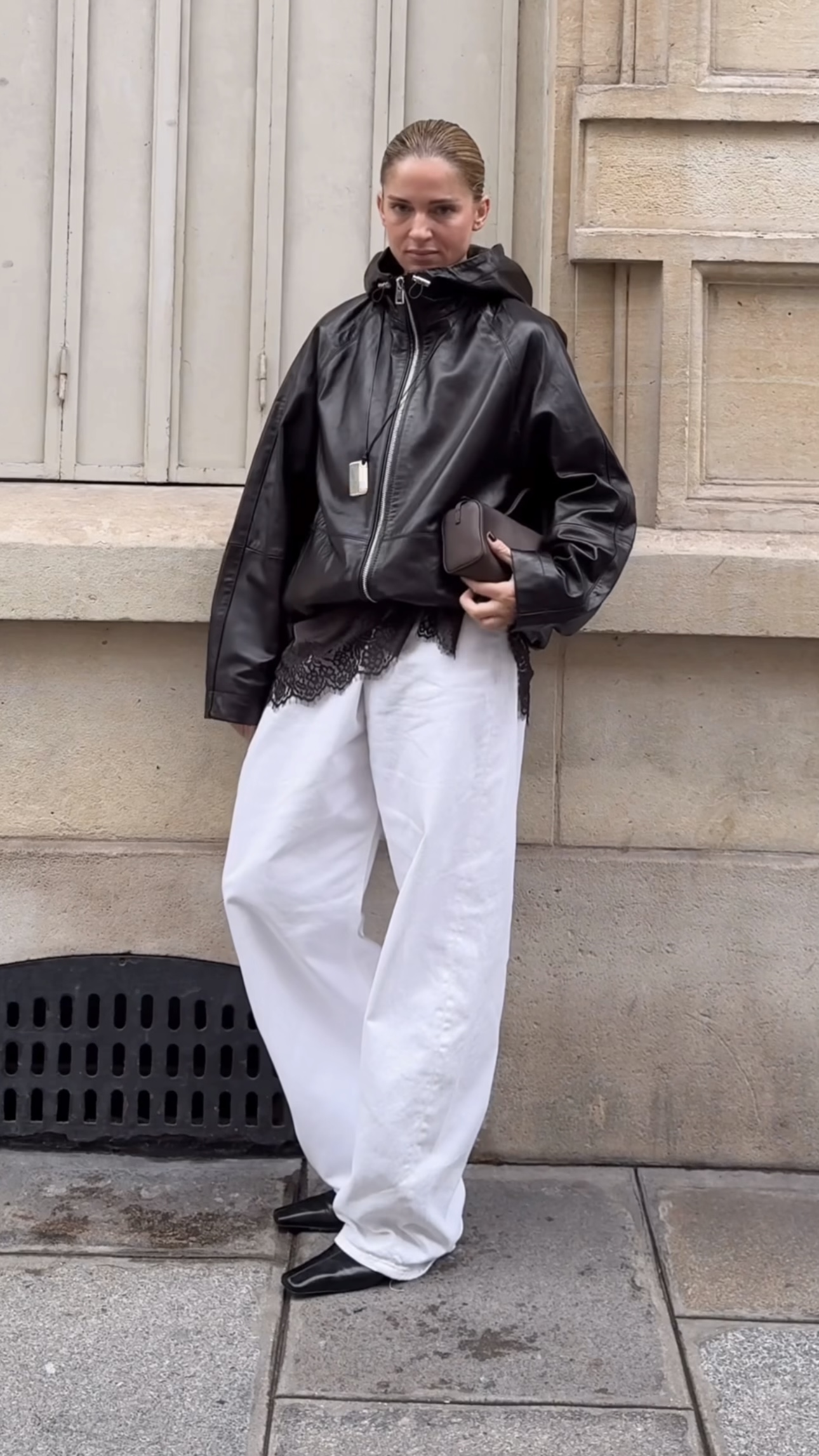 I’m wearing the Uniqlo white blouson jacket , lace slip as before, the barrel leg jersey pants and white mules from zara