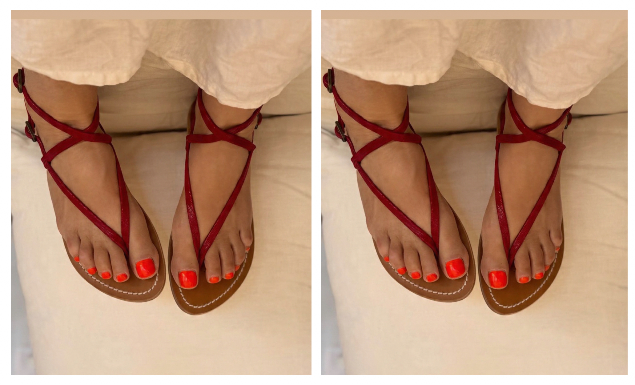 A sneaky way to add a little colour to your neutrals? A dash of red is all you need . They’re sophisticated enough to wear in the city with a white slouchy trousers suit or say, a camel jumpsuit or A line midi dress. That’s because the tan sole looks great with any neutrals or white. Of course these are sandals are totally perfect for casual weekends and on my beach holiday they looked so great with caftans, linens and white. And orange toes with a red sandal is. Match made in heaven ( and the only colour you will see me wear !).