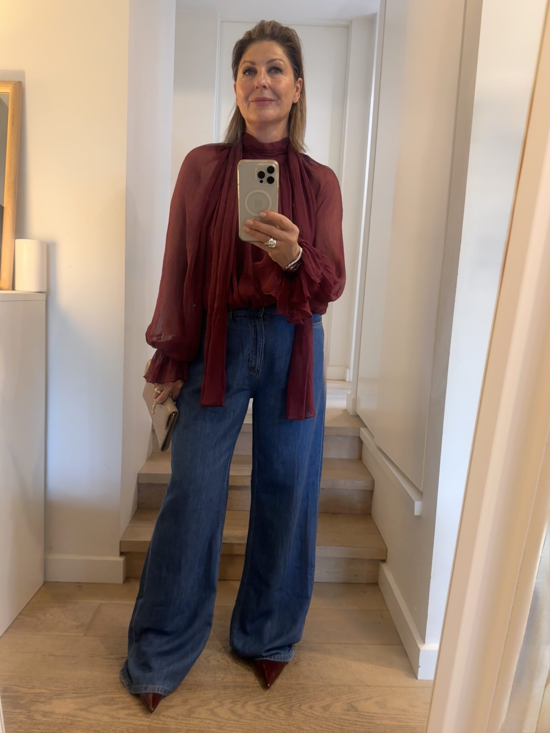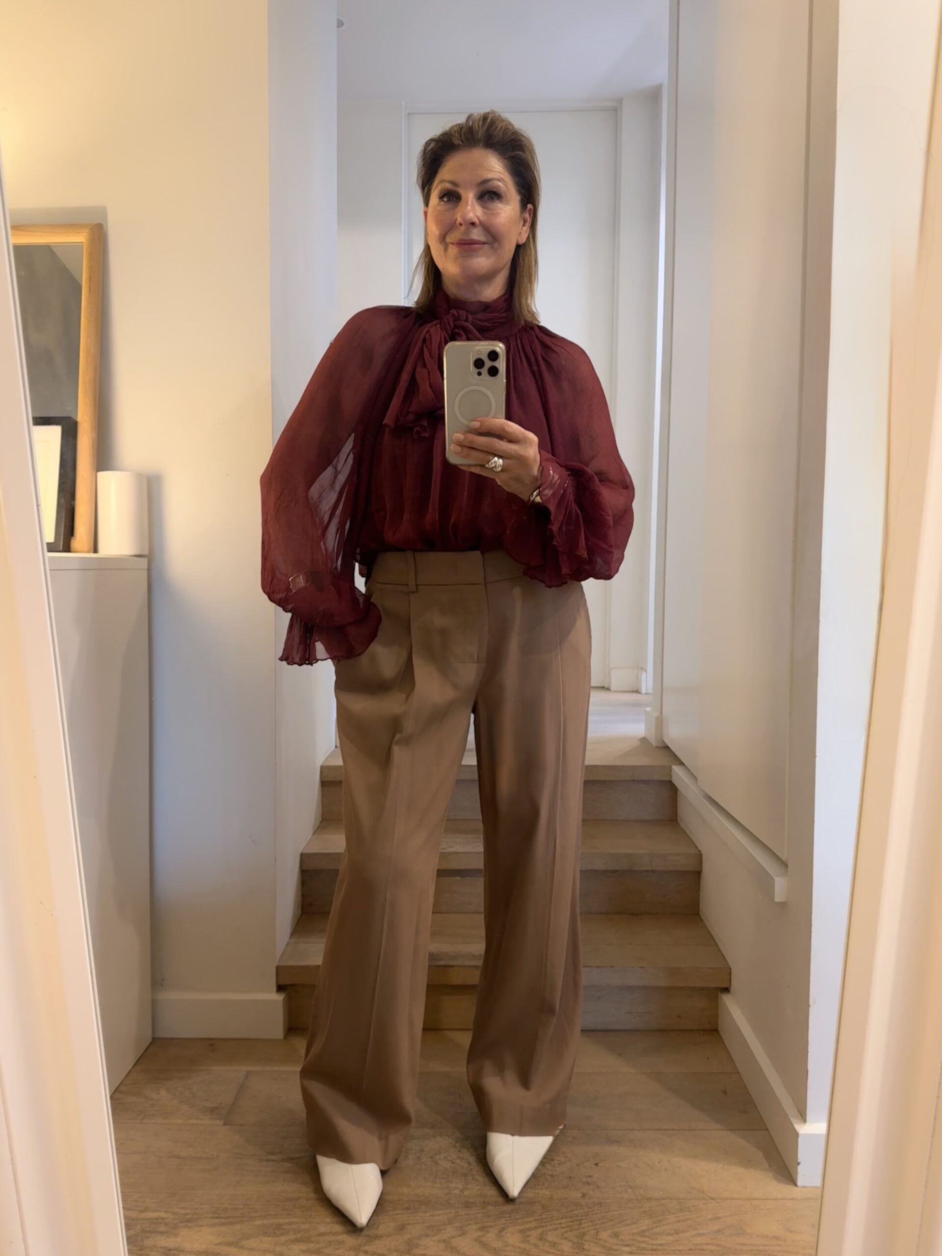 I nabbed this fabulous sheer burgundy blouse last year (see below) and it was the gap in my wardrobe. A soft pretty fabric and a little sheer with a pussy bow but it is not giving off office vibes more a sexy 70’s YSL look. It’s a great piece to wear for smart casual, when you want something elevated.  I love the idea of mixing interesting colours together this season. A burgundy blouse with chocolate brown pants. It feels fresh and new after wearing head to toe camel ! Also tried this blouse with camel pants and jeans. See below. Just to give you ideas. In terms of a jacket I will toss a trench on my shoulders . Found a few similar blouses here and here and here.