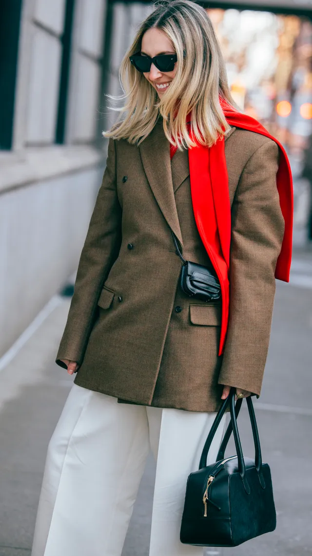 When the new Chanel designer Mathieu Blazy shows touches of red, you take note ! I Love the idea of red in accessoires or as the sweater tossed like a scarf around the neck or hips like this below. It’s the way you get colour in your wardrobe without, you know, taking over. The clever thing about this pop of colour is that you can still keep wearing ALL your neutrals and brown but it changes it up a bit.  Love this sweater from Uniqlo ( I have in camel and orange) and now it’s in a lovely red. You don’t need to spend a fortune to get the look.