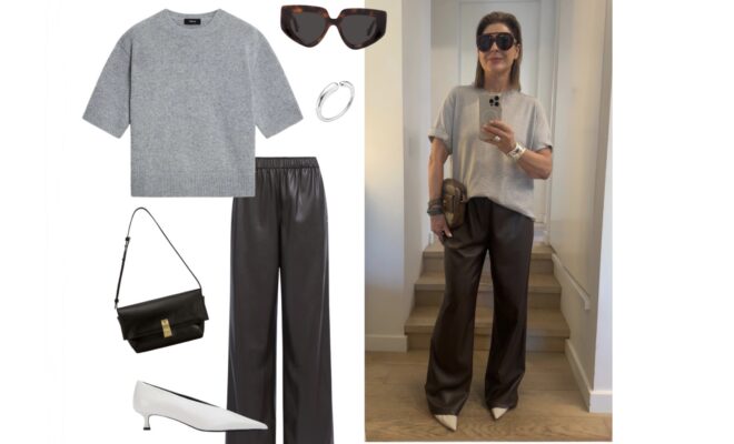 Love these divine choc brown pleather pants with this gorgeous cashmere grey tee (both gifted David Jones.)