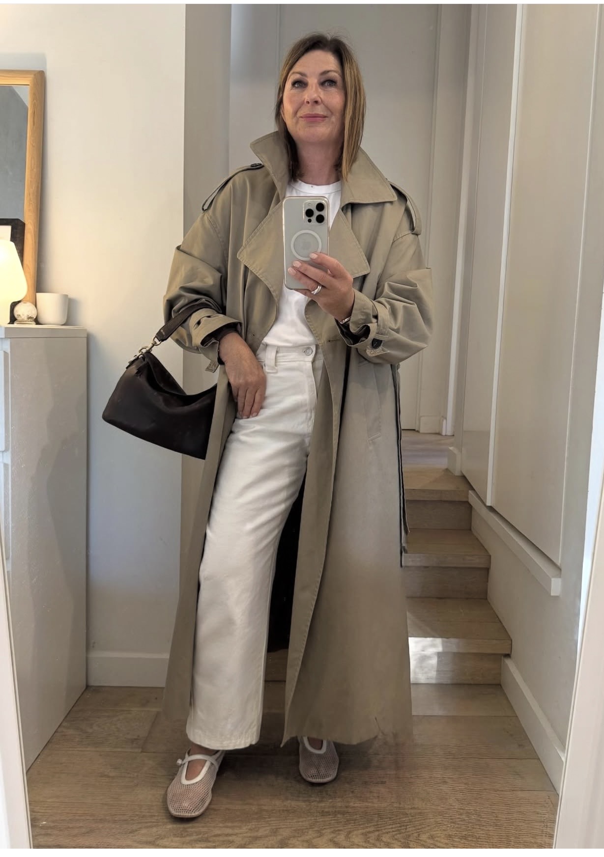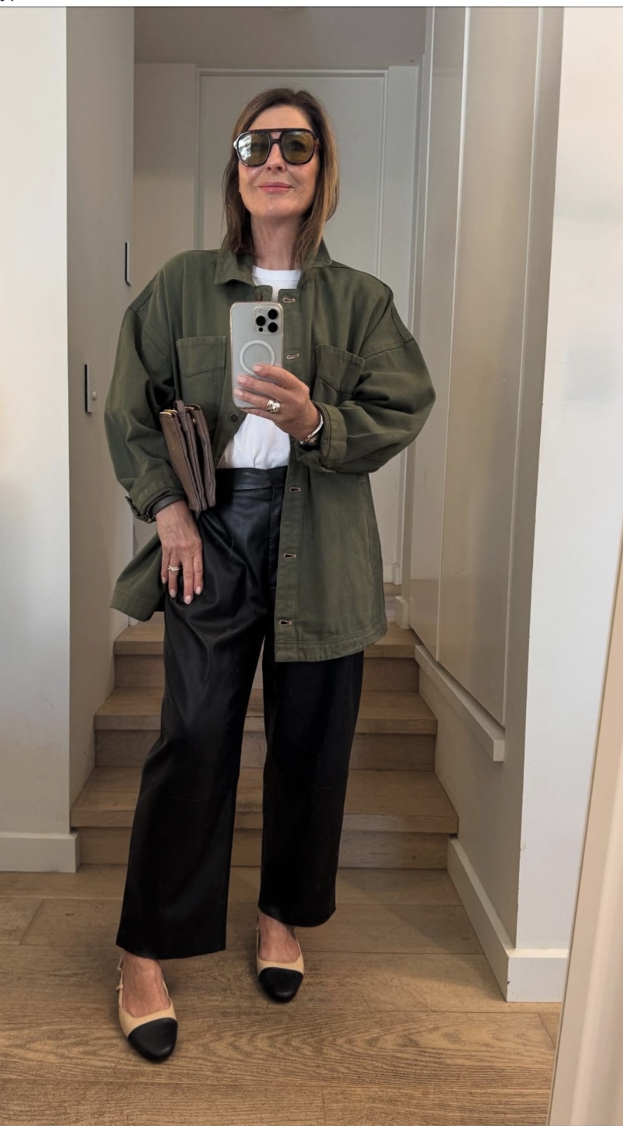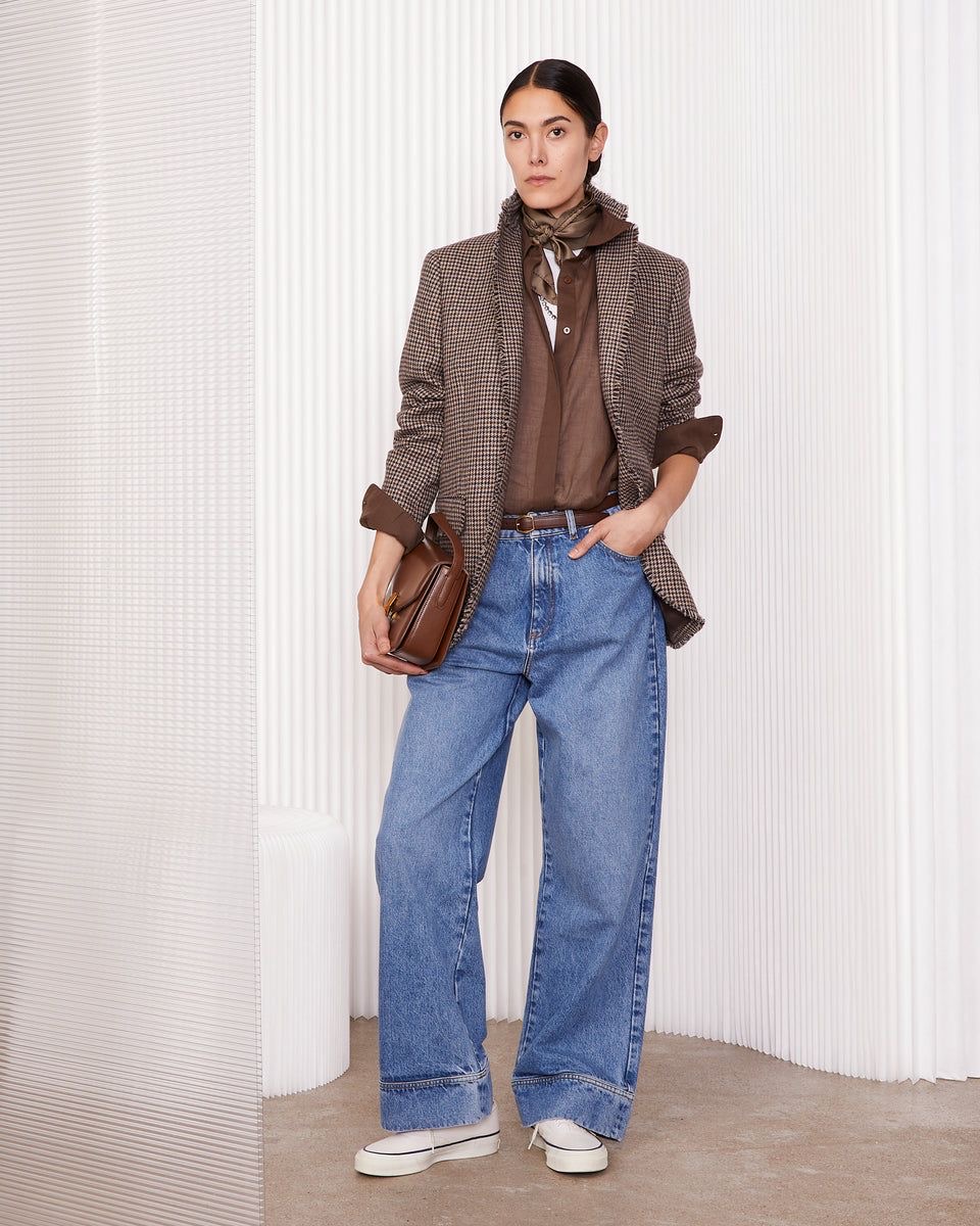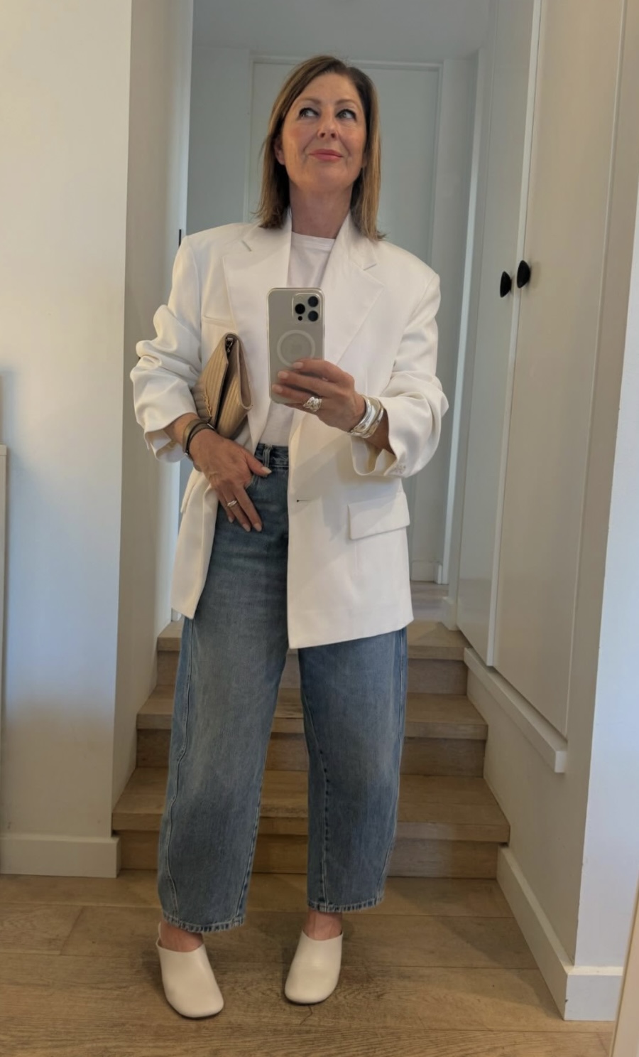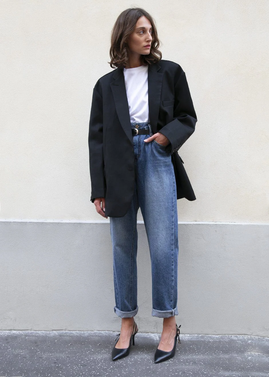 You want a cut that is big and roomy. Which means it looks fashion. It looks effortless. Feels easy. What’s not to love about being comfortable! Sometimes when you’re trying something new on you look in the mirror and you’re just not sure. My tip: go up a size! Jeans too tight? Get a size bigger. They sit lower. Usually longer in length too. Same with a skirt. That blazer that feels too tight and neat?  Go up a size or two, suddenly it looks cool. Ditto a white tee or blue shirt: both look better when looser. I can guarantee when you go up a size, suddenly the proportions change.  And the pieces that are cheap and chic they suddenly look expensive: Instant cool. Shoes? Haha stick to your own size.