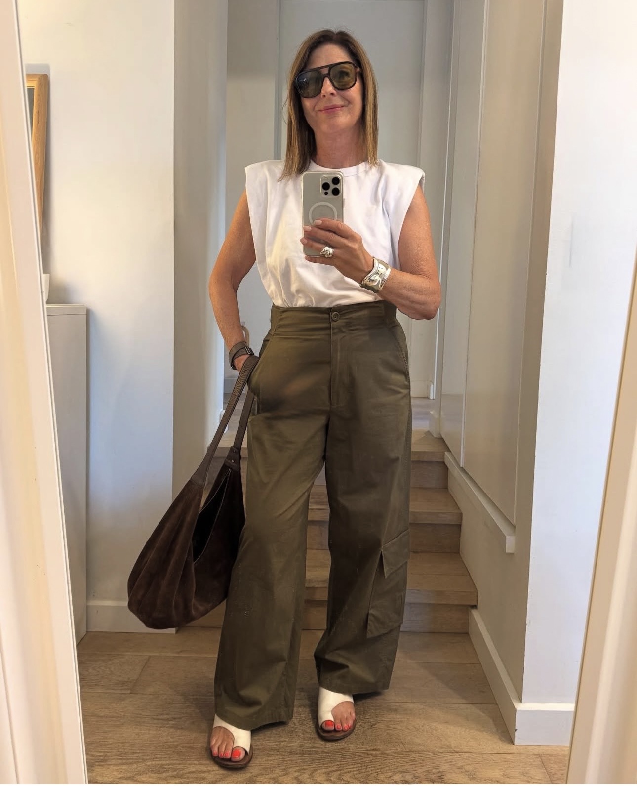 Love this brown bag, this suede bag, and this is great , try this casual cross body black bag with silver or white shoes.